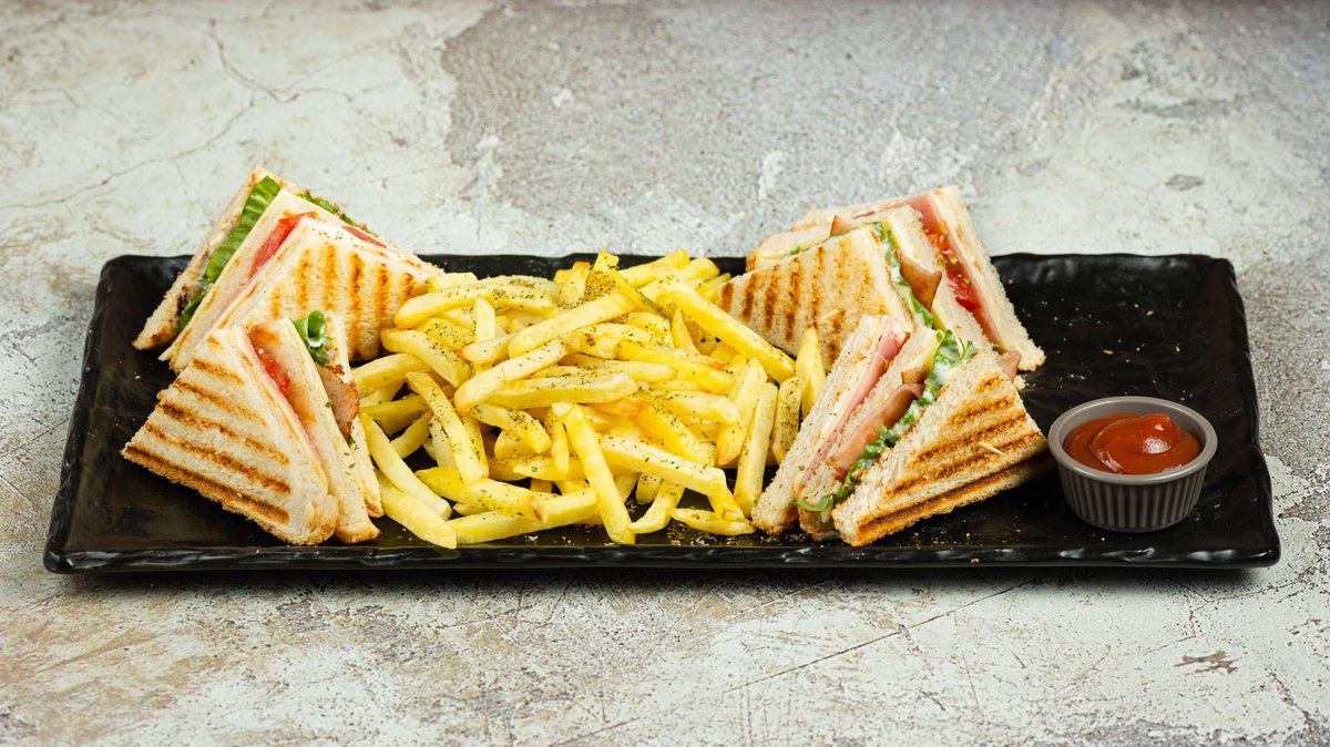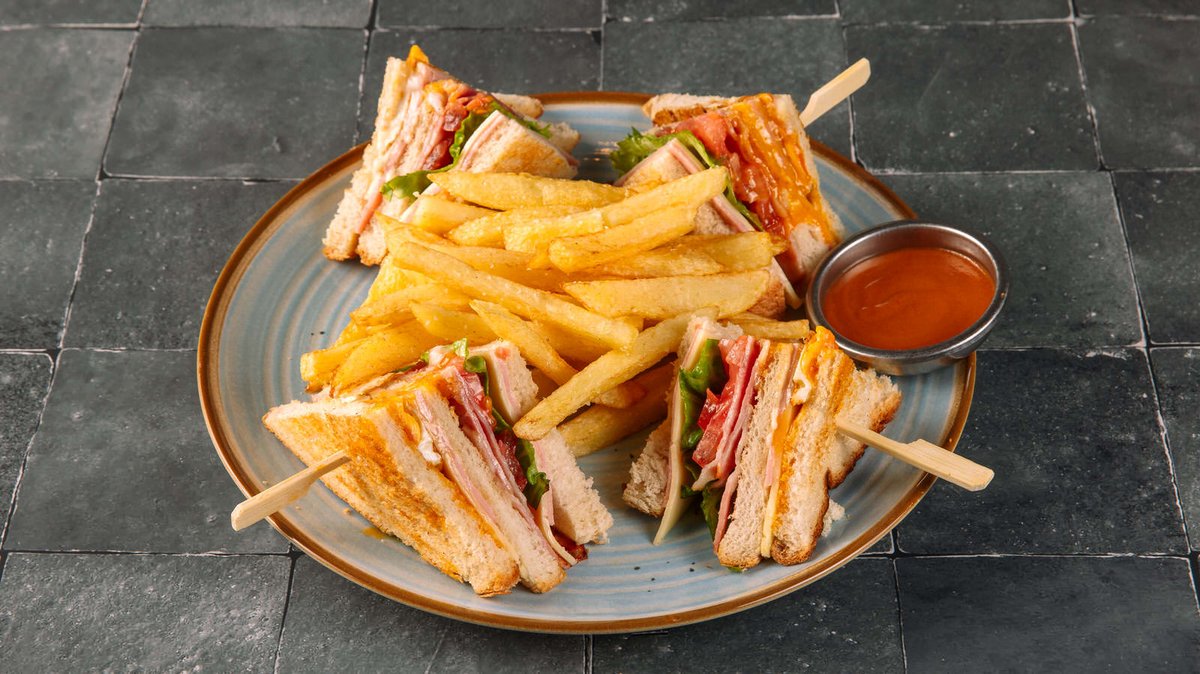 Με αυγό, gouda, ζαμπόν, ντομάτα, μαρούλι και μαγιονέζα. Συνοδεύεται από πατάτες τηγανητές
