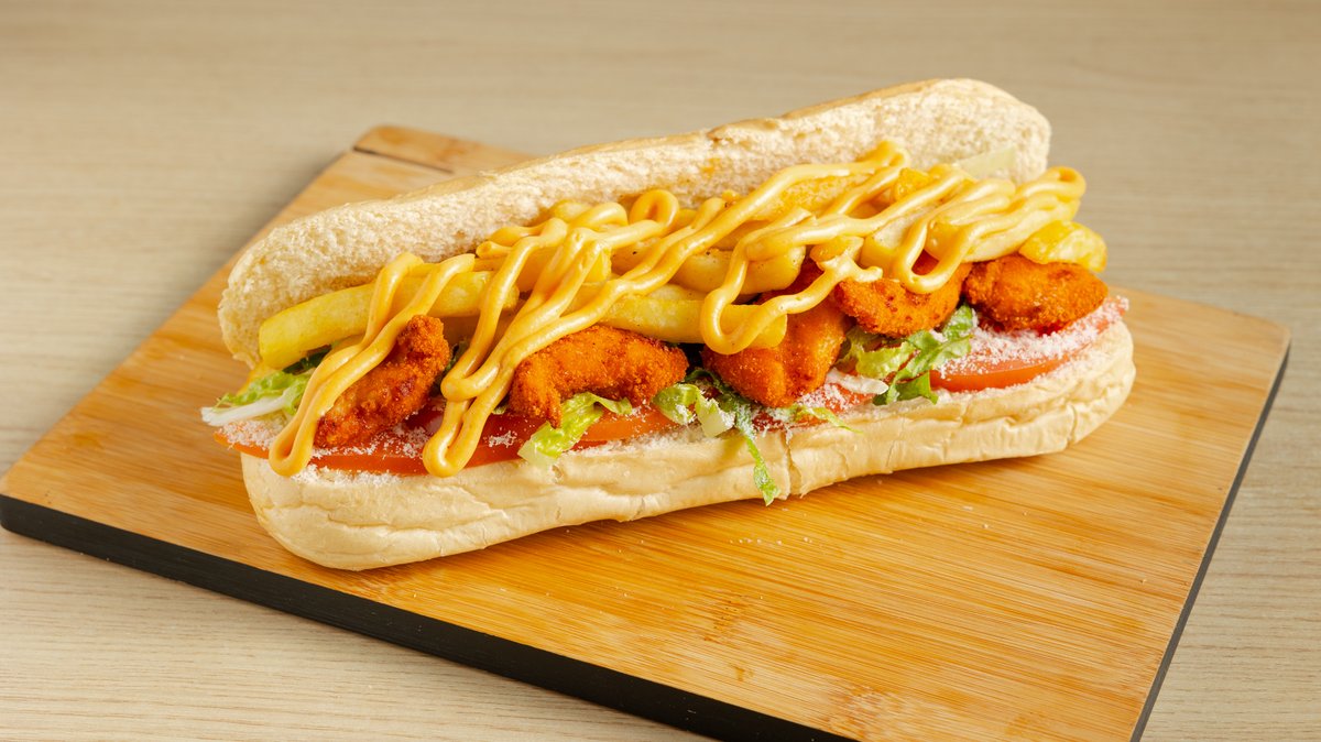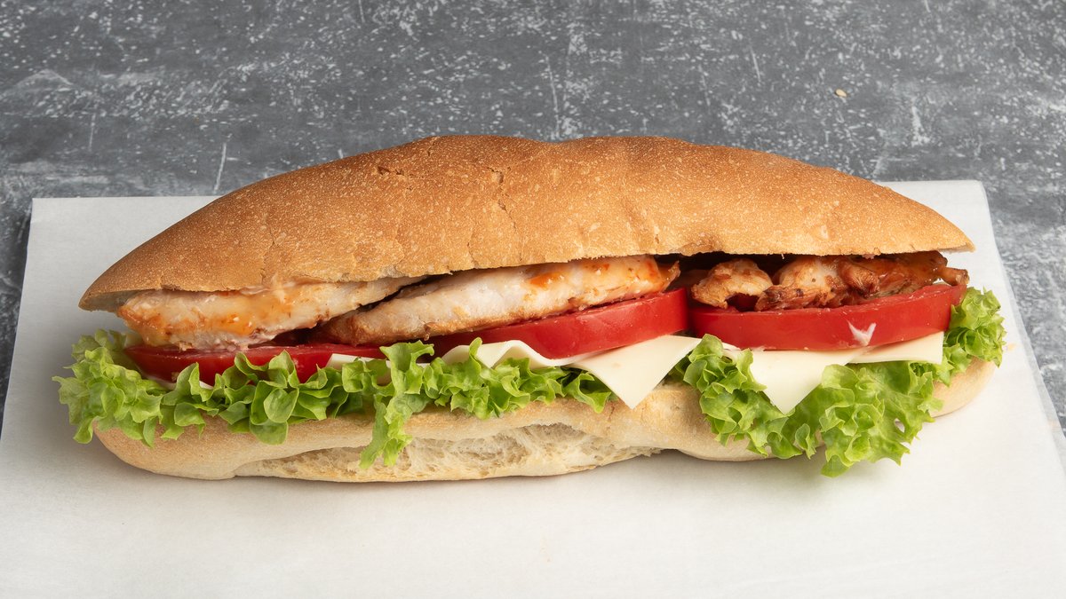 Με φιλέτο κοτόπουλο, gouda, μπέικον, ντομάτα, μαρούλι και μαγιονέζα. Συνοδεύεται από πατάτες τηγανητές
