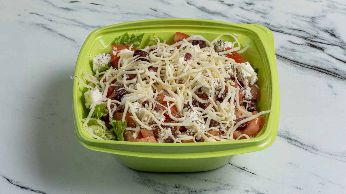 Με φέτα, ντομάτα, πιπεριές, αγγούρι, μαρούλι, ελιές και sauce ρίγανη. Συνοδεύεται από πατάτες stick φούρνου