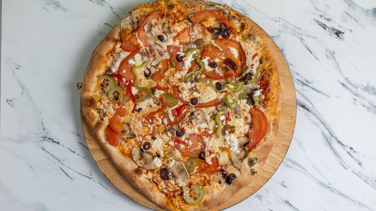 Με σάλτσα ντομάτας, gouda, mozzarella, φέτα, ντομάτα, πιπεριές, μανιτάρια, ελιές και ρίγανη