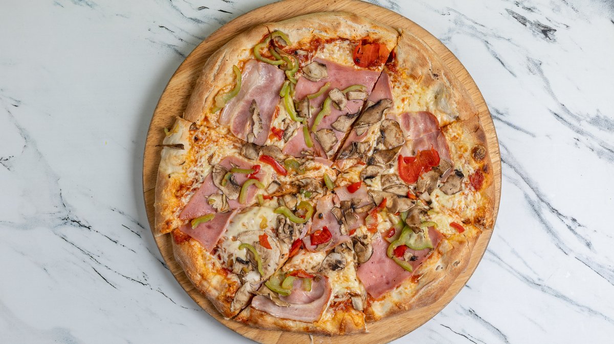 Με σάλτσα ντομάτας, gouda, mozzarella, μπέικον, ζαμπόν, μανιτάρια και πιπεριές