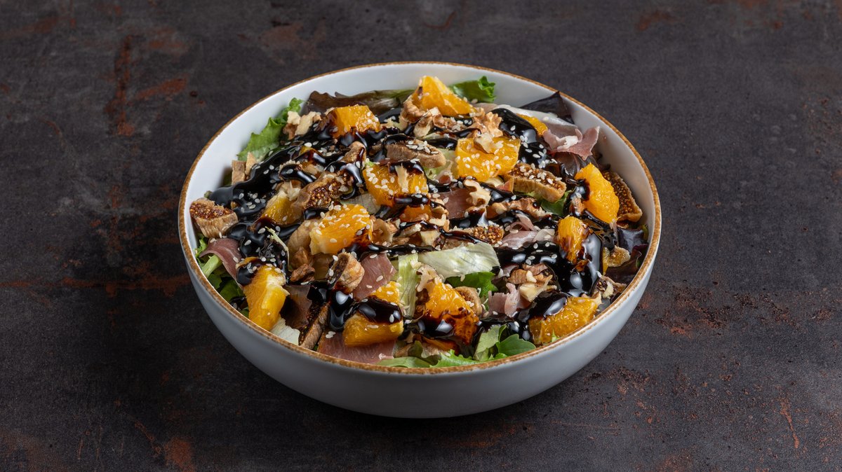 Σαλάτα με ανάμεικτα λαχανικά, κοτόπουλο, καλαμπόκι, flakes παρμεζάνας, κρουτόν και Caesar`s sauce