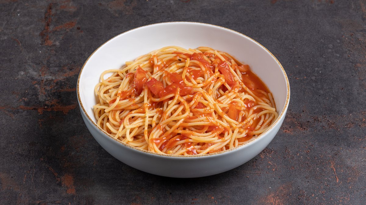 Με σάλτσα ντομάτας, ντοματίνια, κρεμμύδι και φρέσκο βασιλικό. Συνοδεύεται από τριμμένη παρμεζάνα και ψωμάκι φούρνου