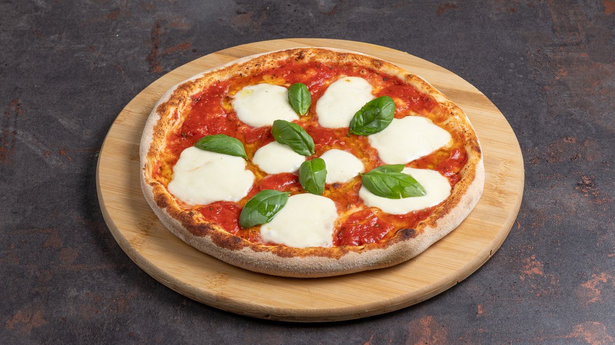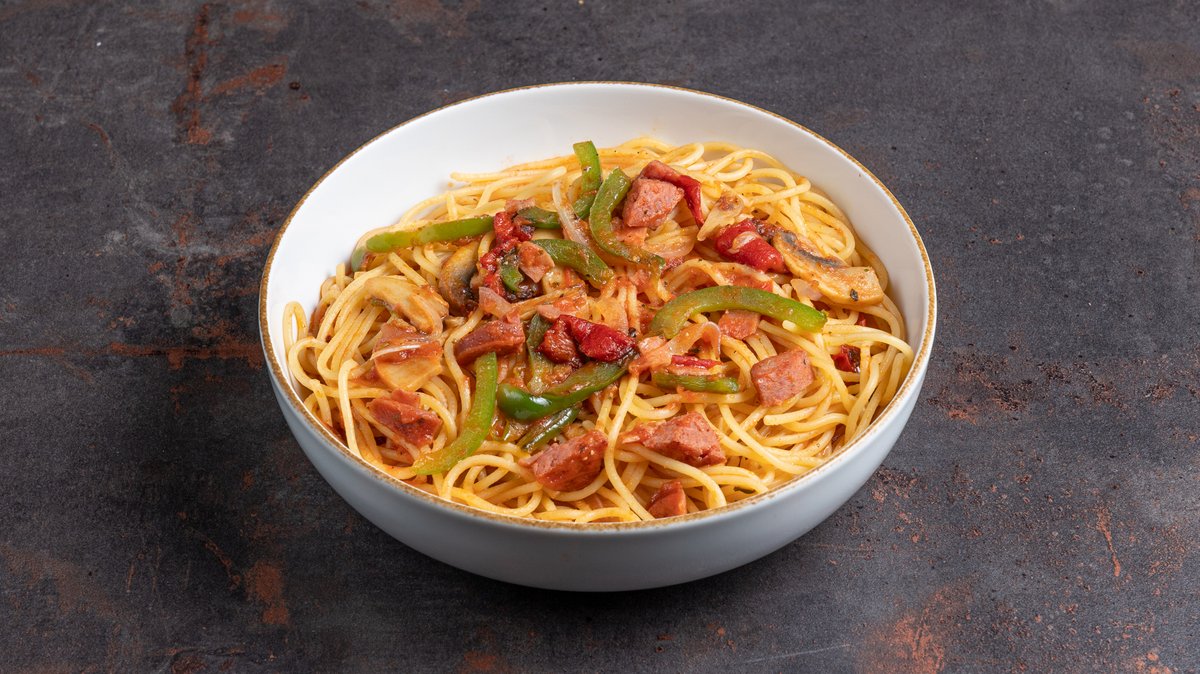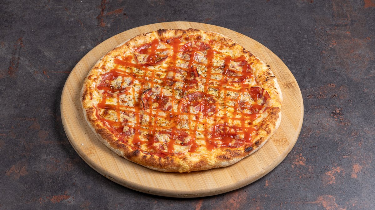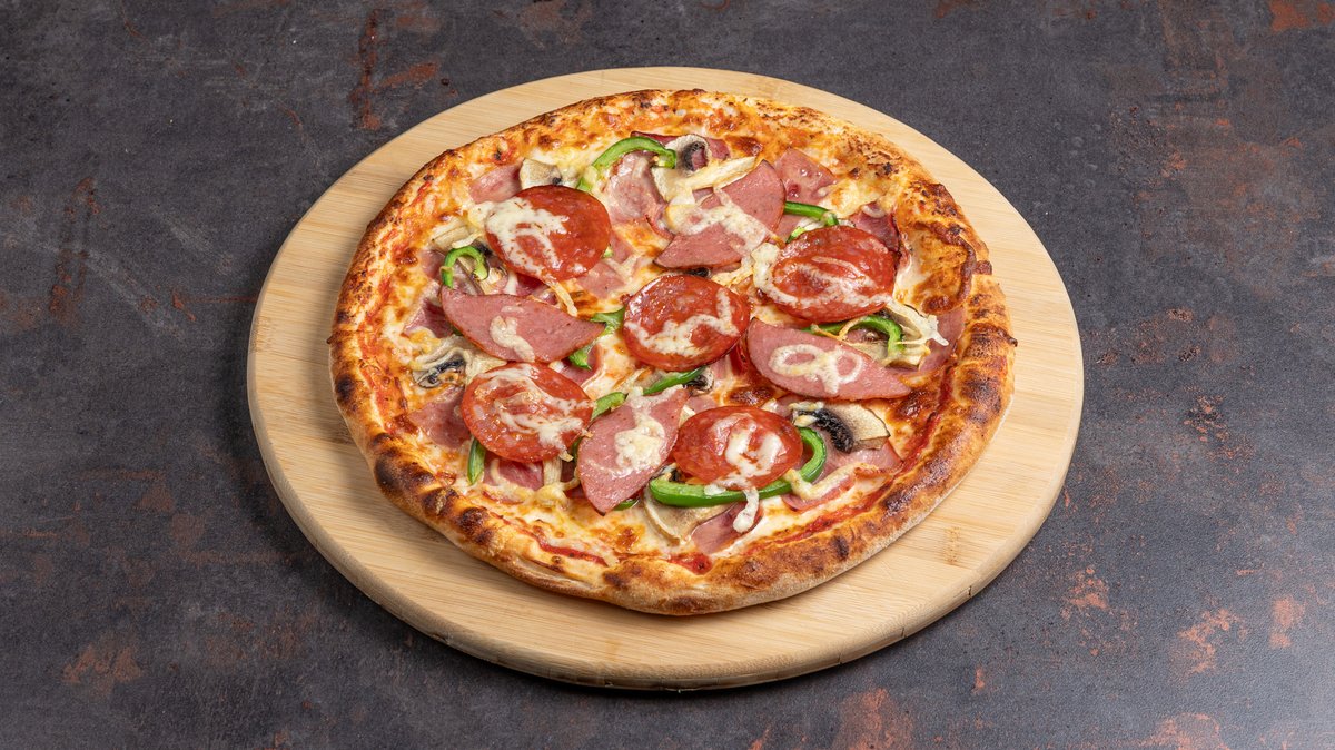 Με σάλτσα ντομάτας, gouda, μοτσαρέλα, ζαμπόν, μπέικον, μανιτάρια και πράσινη πιπεριά