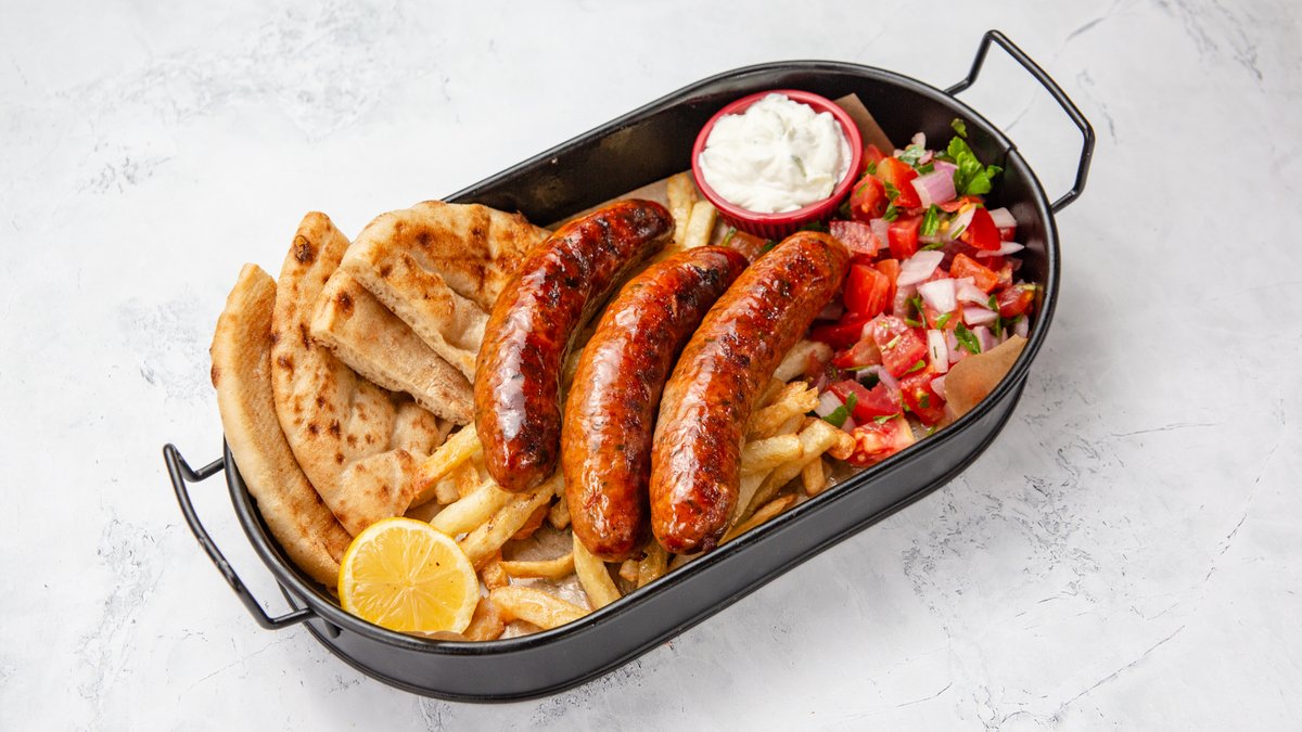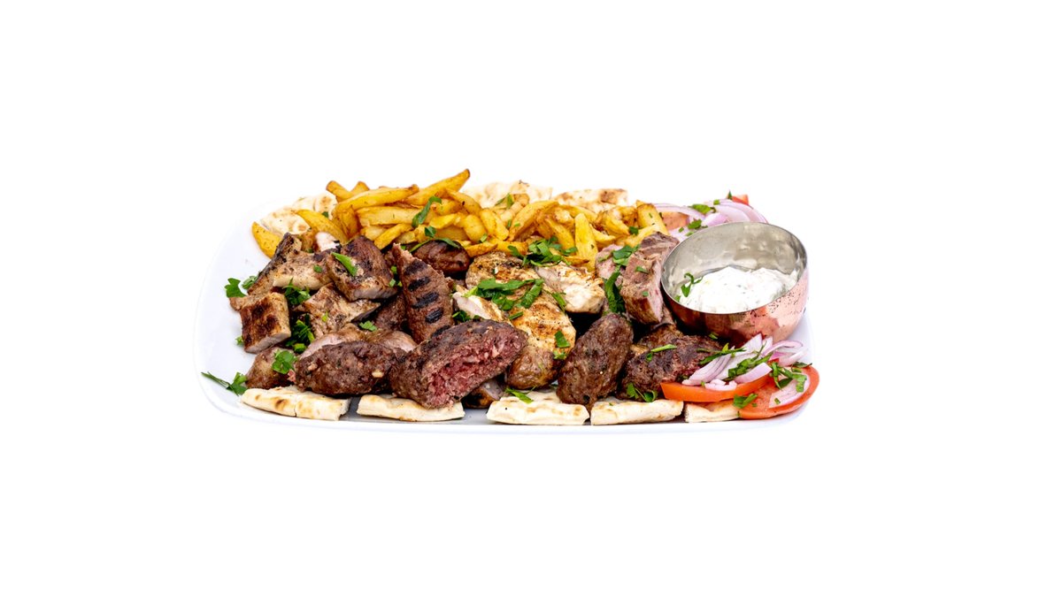 Με 1 σουβλάκι χοιρινό, 1 σουβλάκι κοτόπουλο, 1 λουκάνικο καπνιστό Μυκόνου και 1 μπιφτέκι μοσχαρίσιο. Συνοδεύεται από πίτα και πατάτες τηγανητές