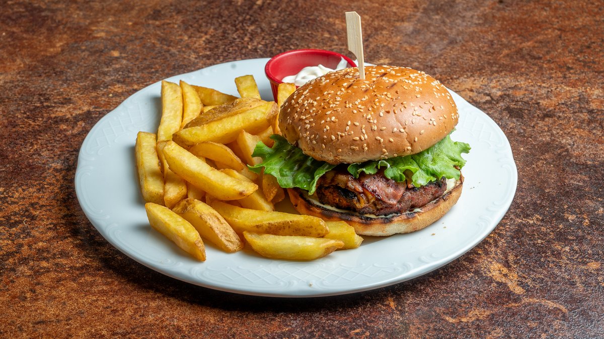 Με μπιφτέκι μοσχαρίσιο, cheddar, μπέικον, ντομάτα, μαρούλι και μαγιονέζα. Συνοδεύεται από πατάτες τηγανητές country και 1 dip της επιλογής σου