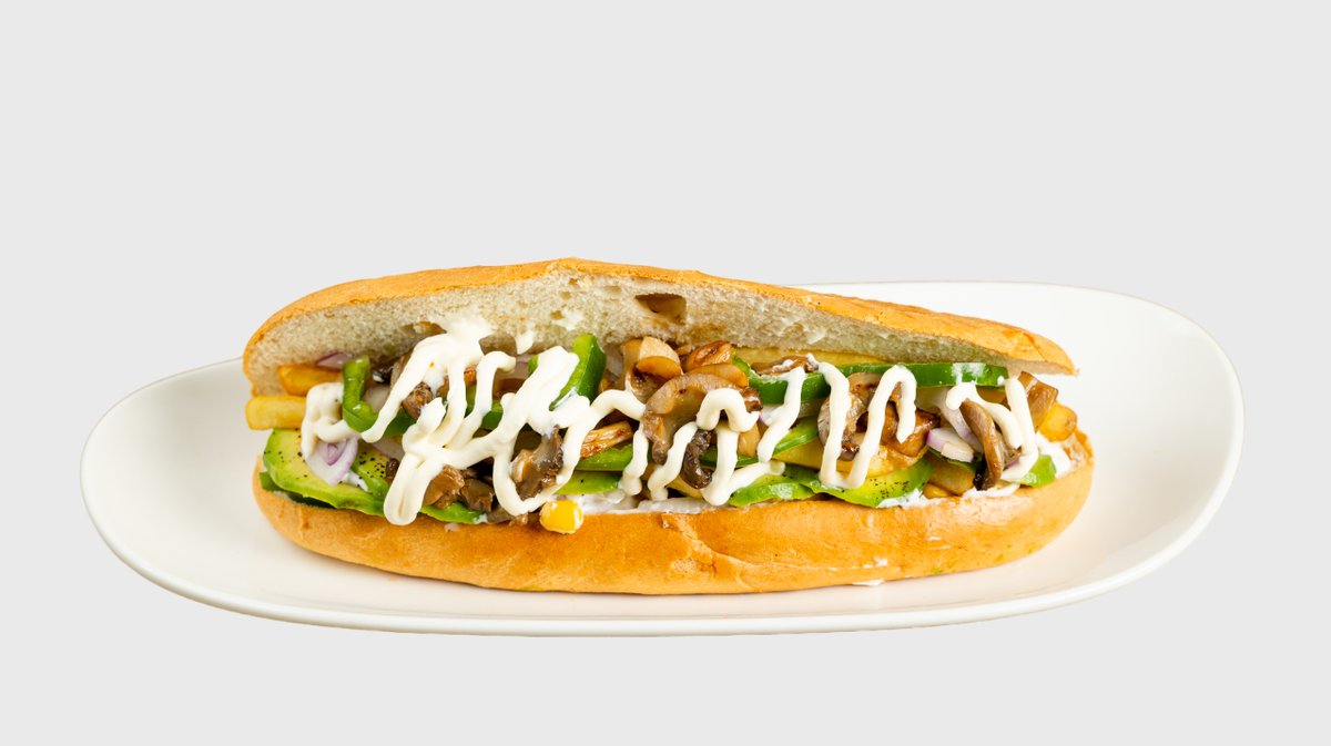 Με τυρί vegan, πατάτες τηγανητές, ντομάτα & μαγιονέζα vegan