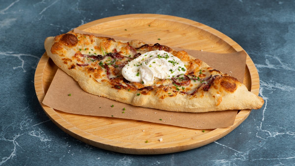 Κρέπα γεμισμένη με ομελέτα και καπνιστό χοιρομέρι, ψημένη στο φούρνο με mozzarella. Συνοδεύεται με κρέμα παρμεζάνας και baby σπανάκι