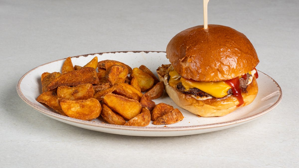 Ψωμί brioche με μπιφτέκι από 100% μοσχαρίσιο κιμά, cheddar, ketchup και μαγιονέζα. Συνοδεύεται από πατάτες τηγανητές και dip μαγιονέζας.