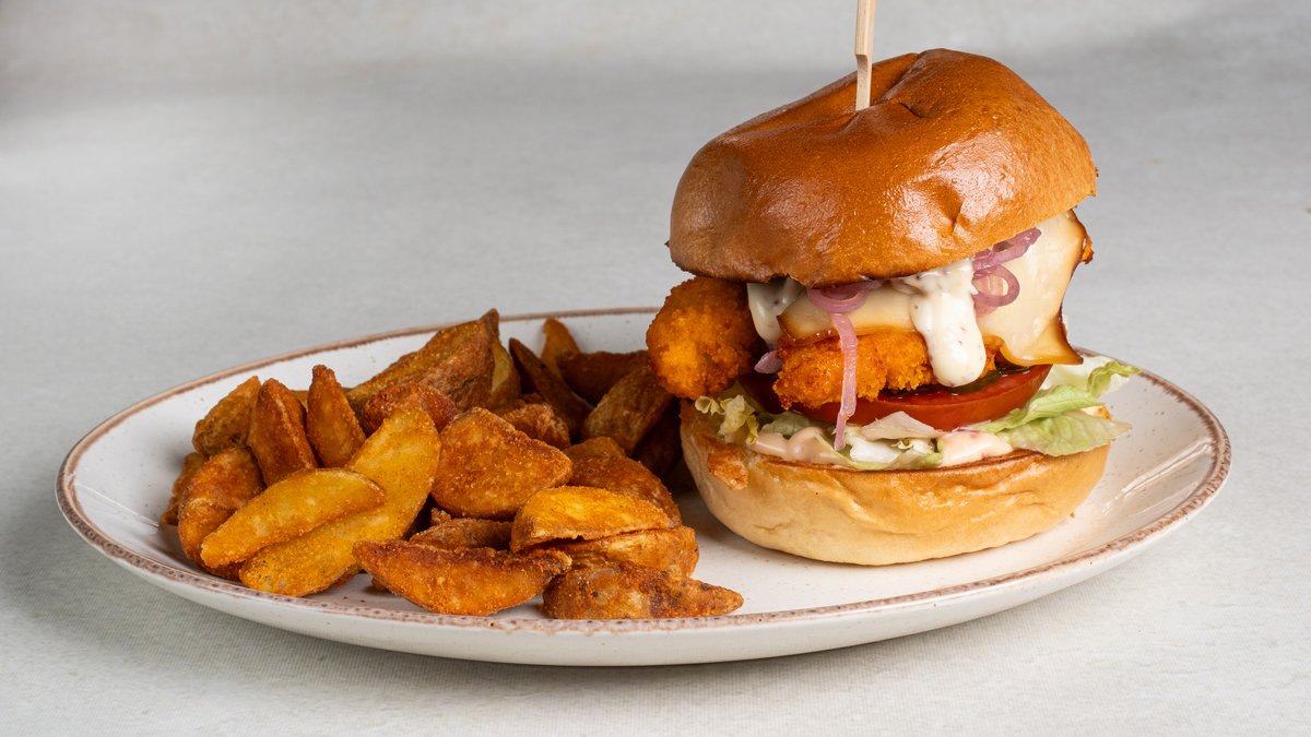 Με κοτόπουλο πανέ, iceberg, ντομάτα, flakes παρμεζάνας και sweet chili mayo. Συνοδεύεται από πατάτες τηγανητές.
