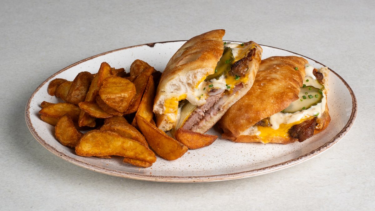 Φοκάτσια με χοιρινό μαγειρεμένο 24 ώρες, τυρί καπνιστό, cheddar, αγγουράκι τουρσί, edam, σχοινόπρασο και μουστάρδα με κόκκους. Συνοδεύεται από πατάτες τηγανητές.