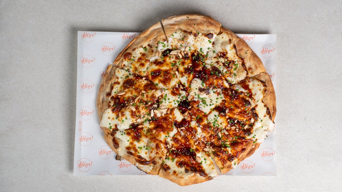 Με κρέμα παρμεζάνας αρωματισμένη με σκόρδο και lime, μοτσαρέλα, chutney καπνιστής πιπερίας, σχοινόπρασο, καβουρδισμένο αμύγδαλο και φρεσκοτριμμένο πιπέρι