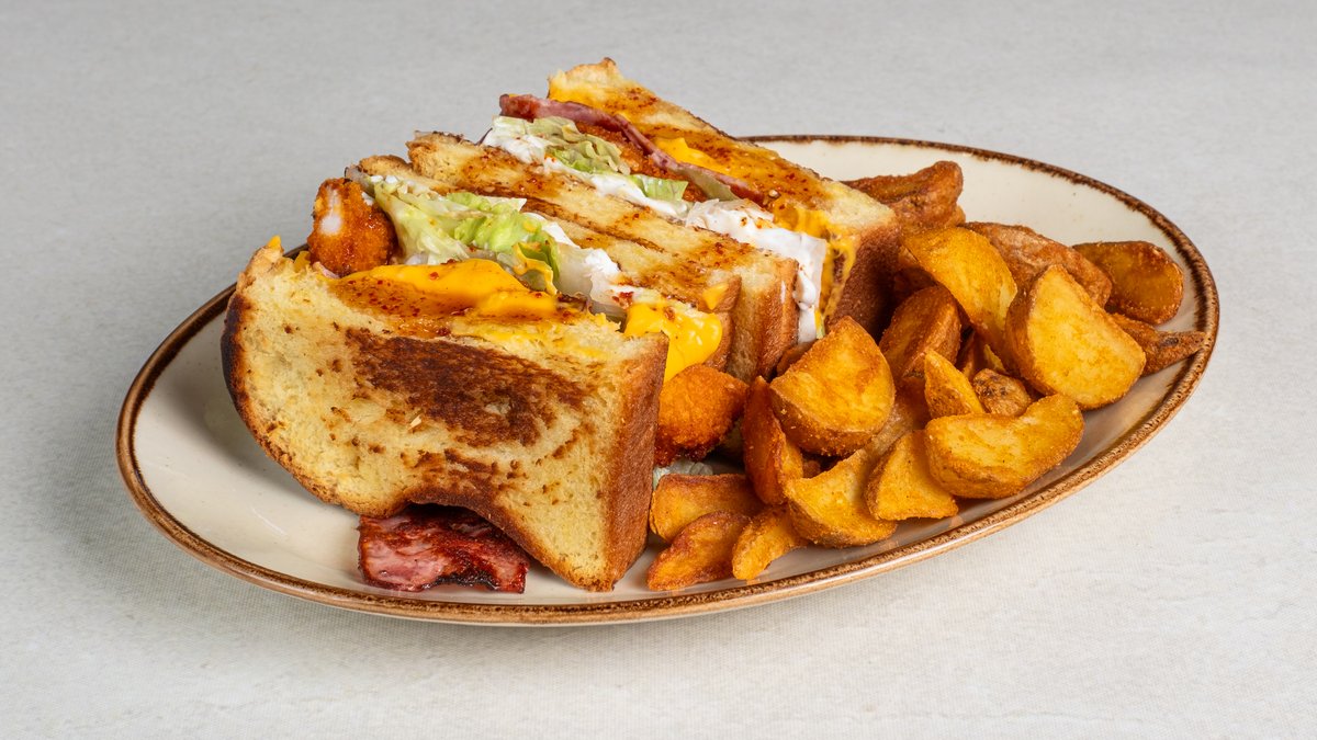 Με ζαμπόν, edam, ντομάτα, golden sauce, iceberg, διπλό μπέικον, golden sauce και μαγιονέζα. Συνοδεύεται από πατάτες τηγανητές.