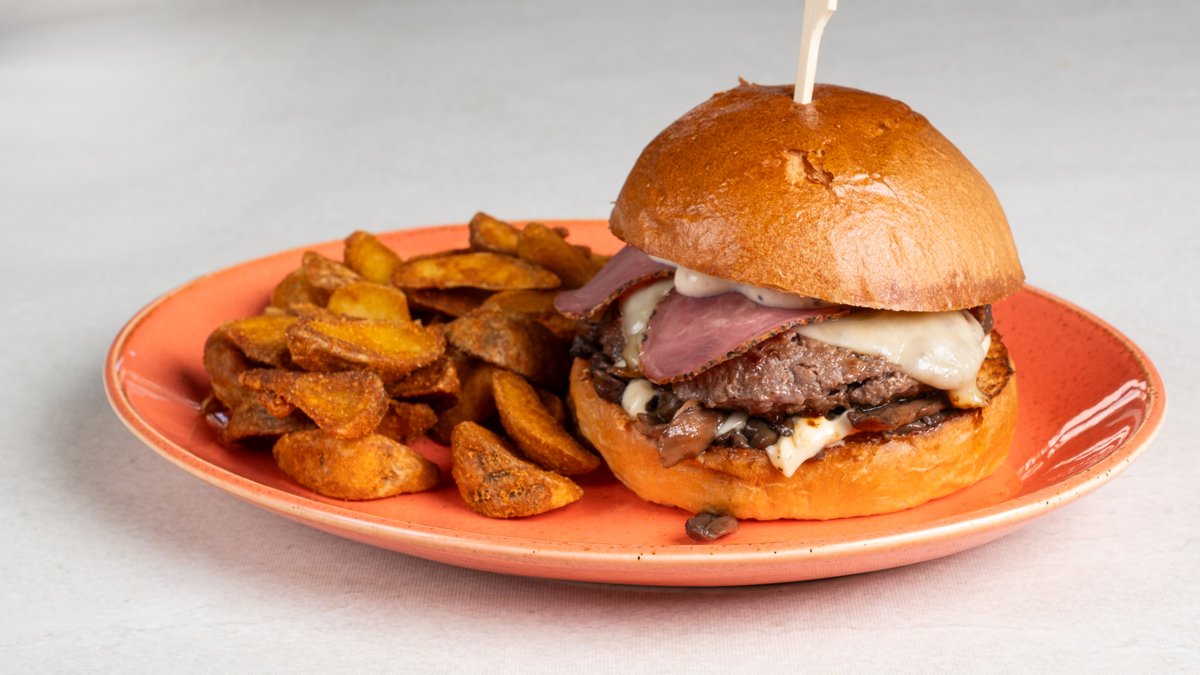 Ψωμί μπριός, μοσχαρίσιο μπιφτέκι 200 g, γραβιέρα Κρήτης, παστράμι, μαγιονέζα με τρούφα, ψητά μανιτάρια, τηγανητές πατάτες