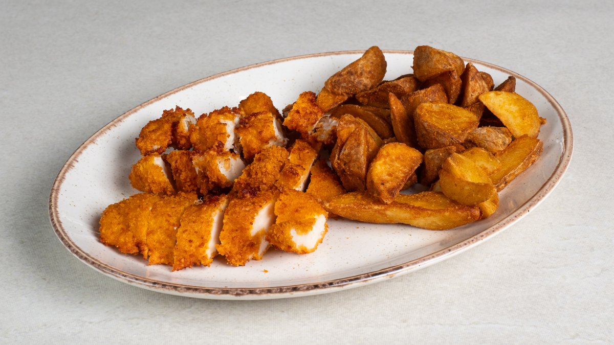Κοτόπουλο φιλέτο πανέ σε μπουκίτσες. Συνοδεύεται από πατάτες τηγανητές και dip μαγιονέζας.