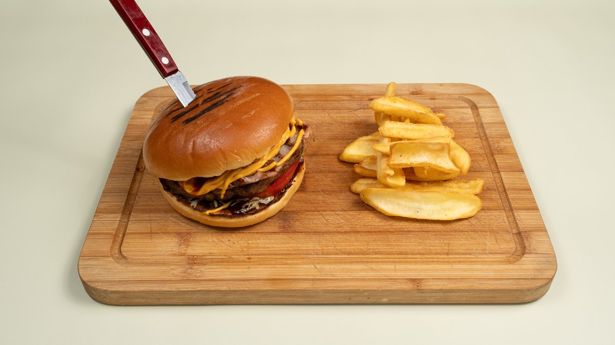 Με μπιφτέκι μοσχαρίσιο, διπλό cheddar, ντομάτα και ροδέλες ψητού κρεμμυδιού. Συνοδεύεται από πατάτες crispies