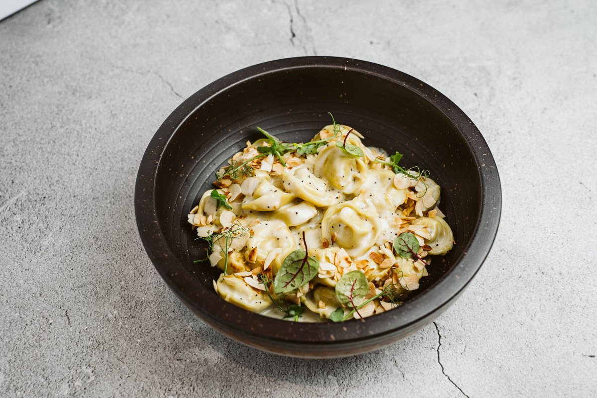 Tortelloni γεμιστό με φέτα, αμύγδαλο και μέλι, λευκή σάλτσα, παρμεζάνα, σουσάμι & παπαρουνόσπορο