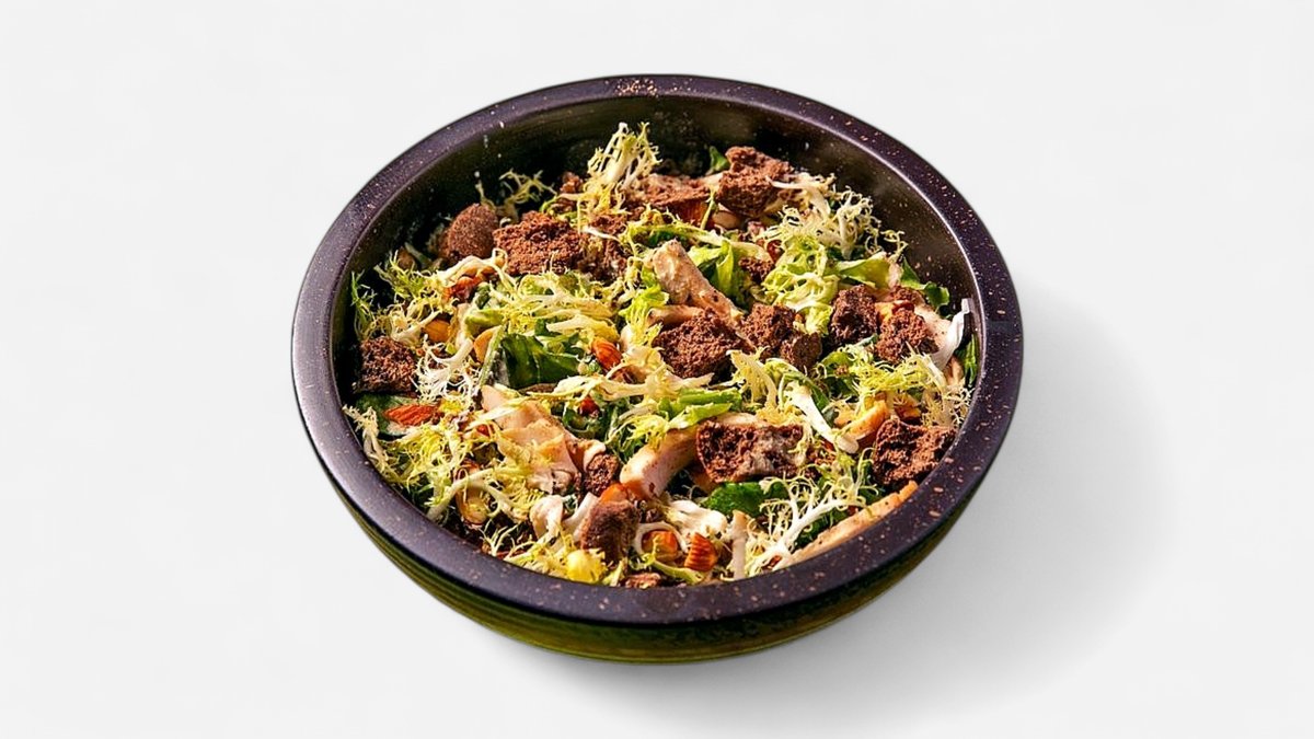 Πράσινη σαλάτα, φιλέτο στήθος κοτόπουλο, dressing γιαουρτιού, αμύγδαλο, παξιμάδι χαρουπιού και flakes παρμεζάνας