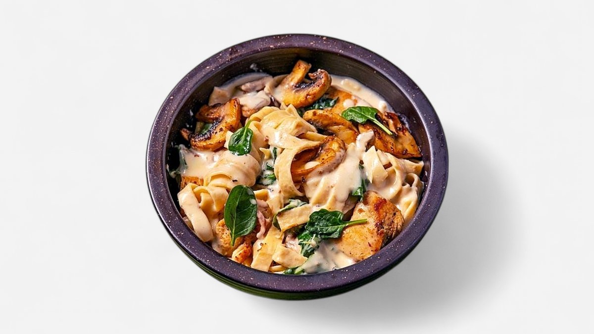Φρέσκα Tagliatelle με χοιρινά φιλετάκια, καπνιστή πανσέτα, ποικιλία φρέσκων μανιταριών, λευκή σάλτσα αρωματισμένη με κρέμα μαύρης τρούφας και θυμάρι