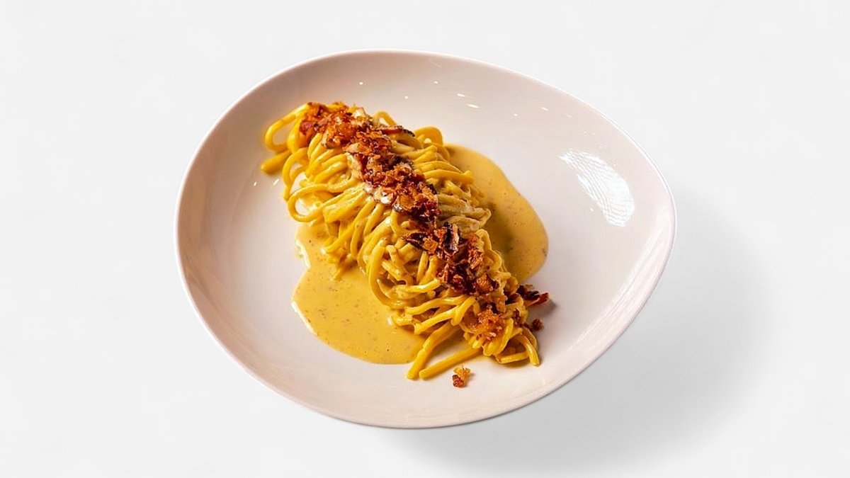 Φρέσκα Spaghetti alla Chitarra, κρόκο αυγού, pecorino, παρμεζάνα, guanciale και καπνιστή pancetta μαύρου χοίρου από την Φάρμα Φωτιάδη