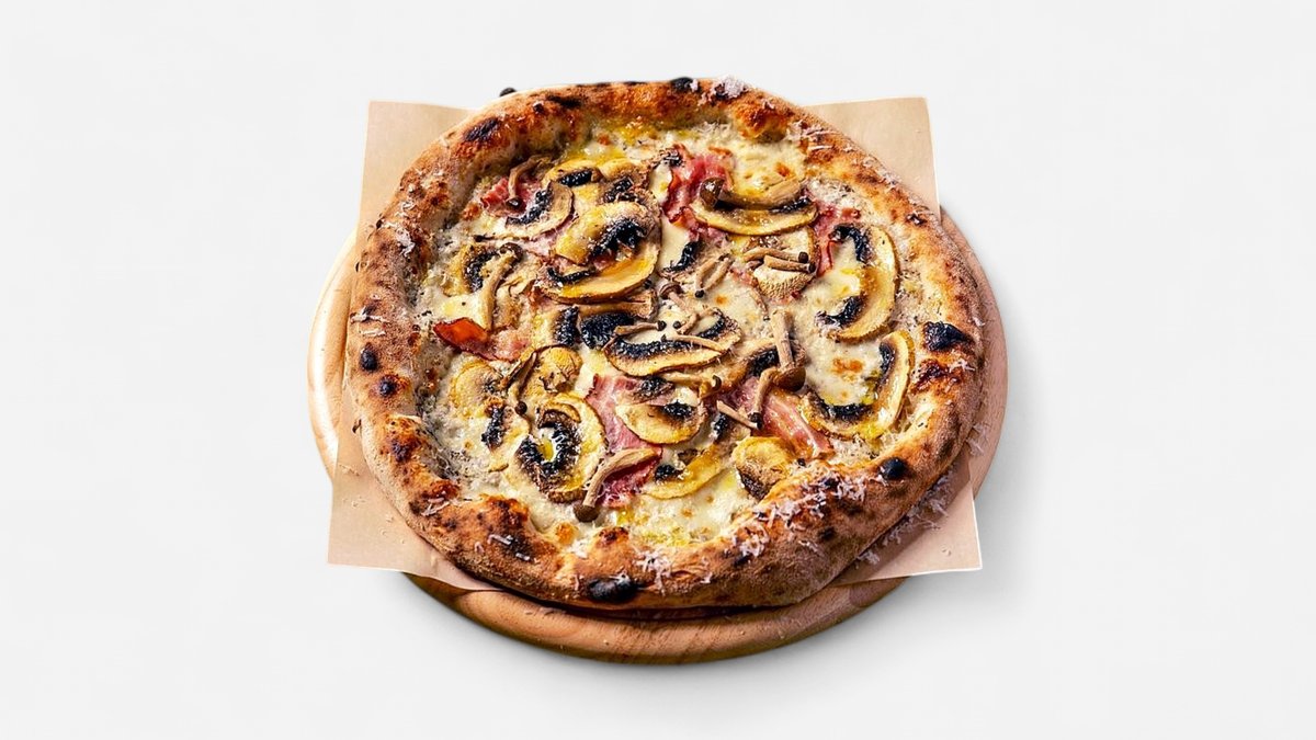 Με σάλτσα ντομάτας, mozzarella, gouda, ζαμπόν από χοιρινή ωμοπλάτη, μπέικον, σαλάμι pepperoni, τρίχρωμες πιπεριές, ποικιλία μανιταριών και ρίγανη