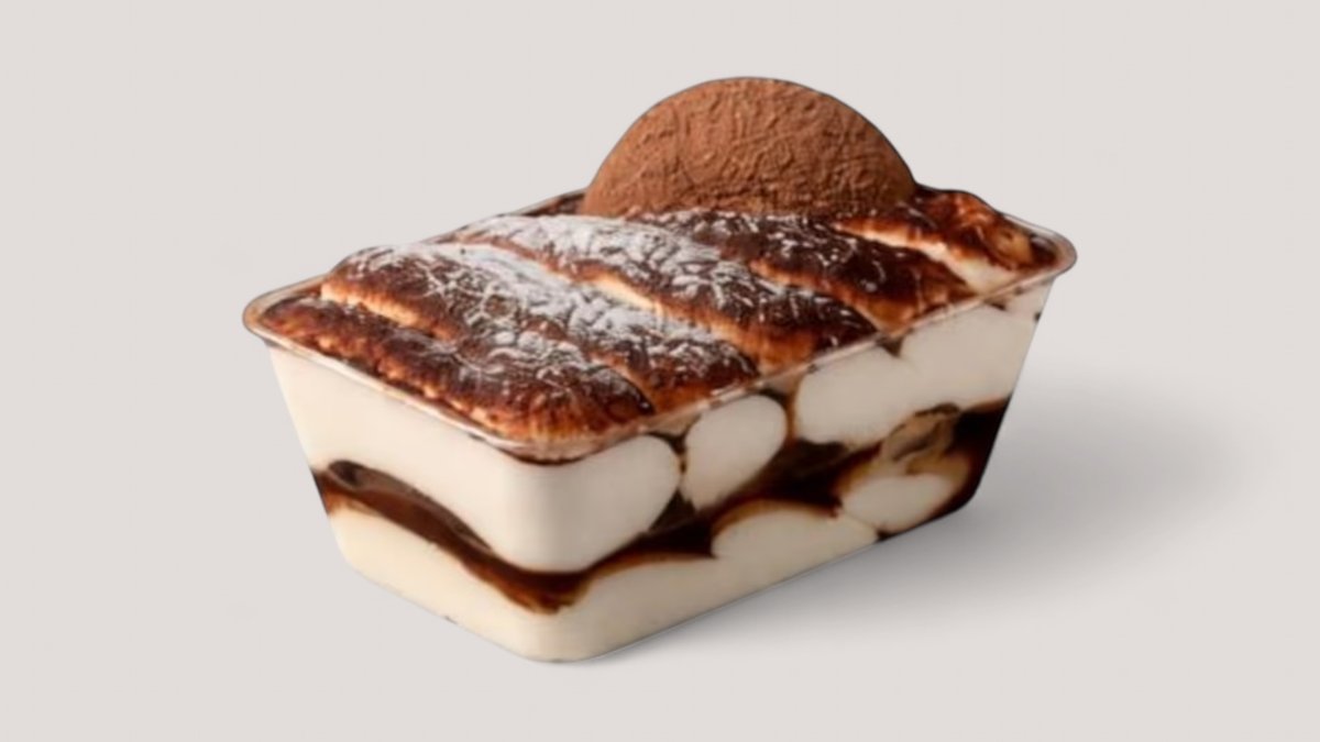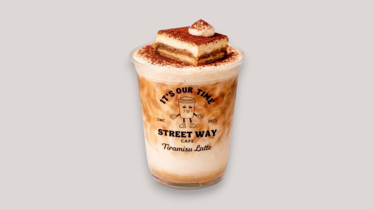 Παγωμένο latte με βελούδινη κρέμα, άρωμα κακάο και γεύση τιραμισού, με μικρό κομμάτι tiramisu από πάνω.