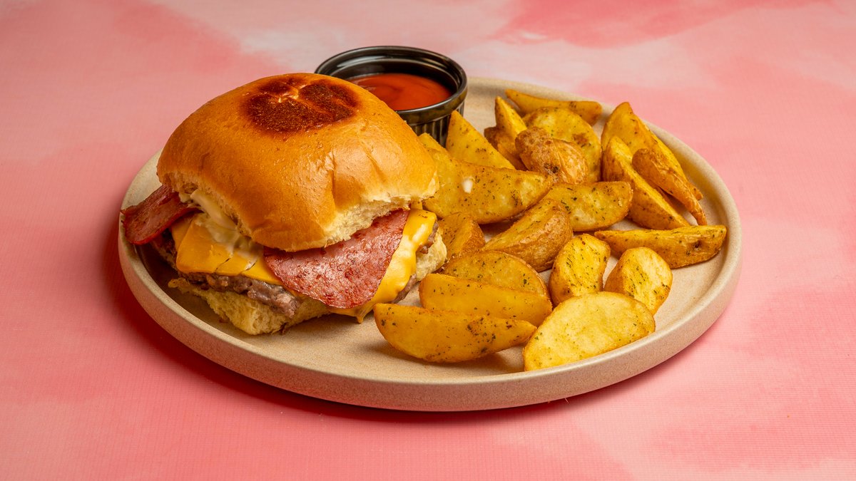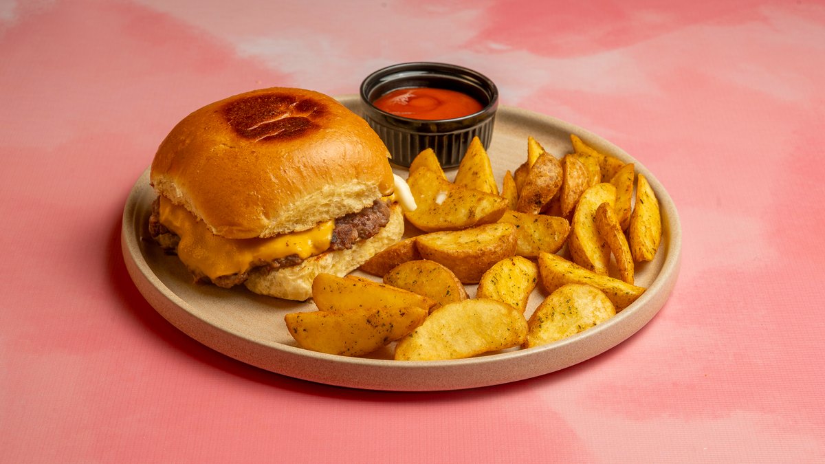 Μοσχαρίσιο μπιφτέκι, τυρί cheddar, biggy burger σως. Συνοδεύεται από πατάτες country