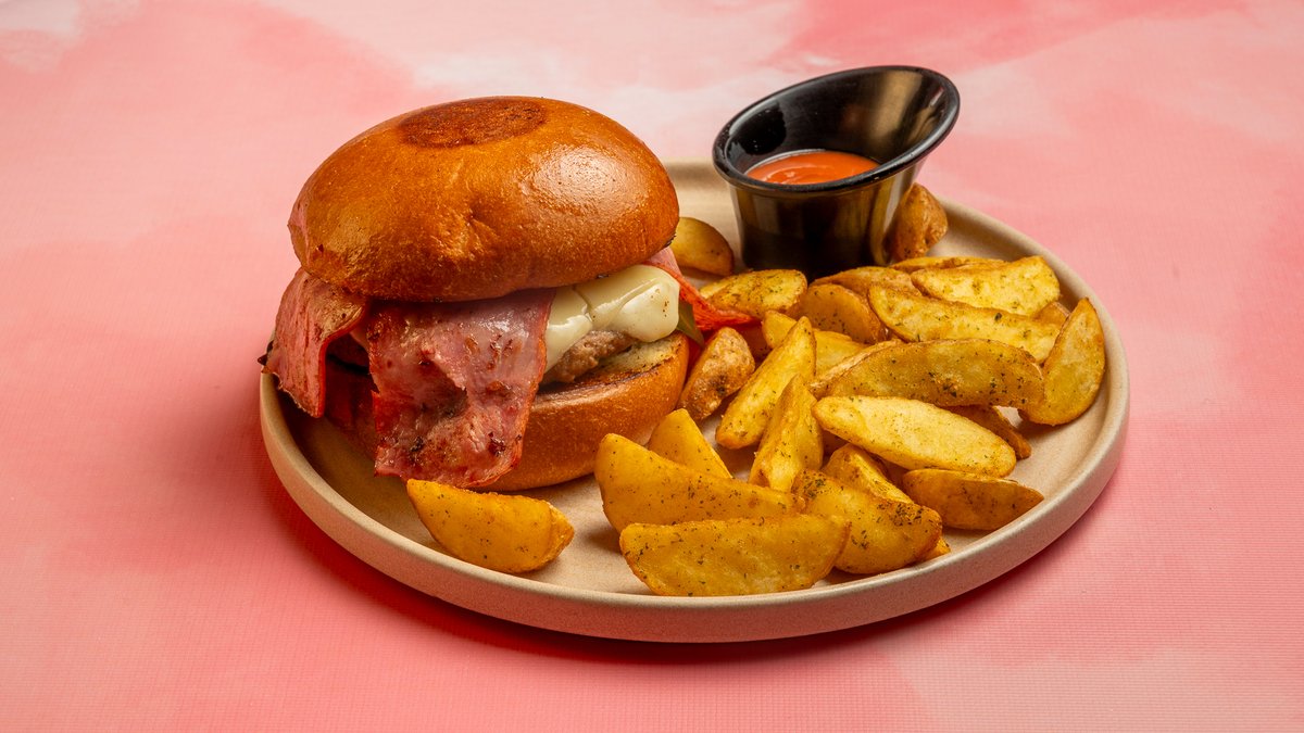 Τυρί γκούντα, φιλέτο κοτόπουλο, μπέικον, ντομάτα, μαρούλι, Caesar’s σως. Συνοδεύεται από πατάτες country