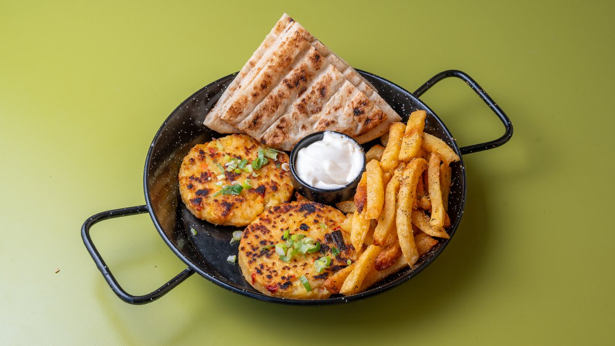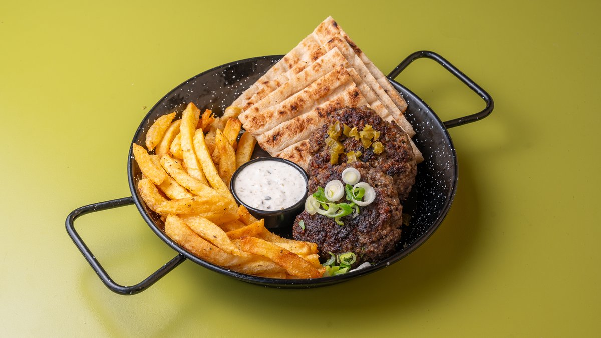 2 ζουμερά μπιφτέκια από 100 % μοσχαρίσιο κρέας στη σχάρα. Σερβίρονται με jalapeños, φρέσκο κρεμμυδάκι, ζεστή πίτα, φρέσκες πατάτες τηγανητές και σως ταρτάρ