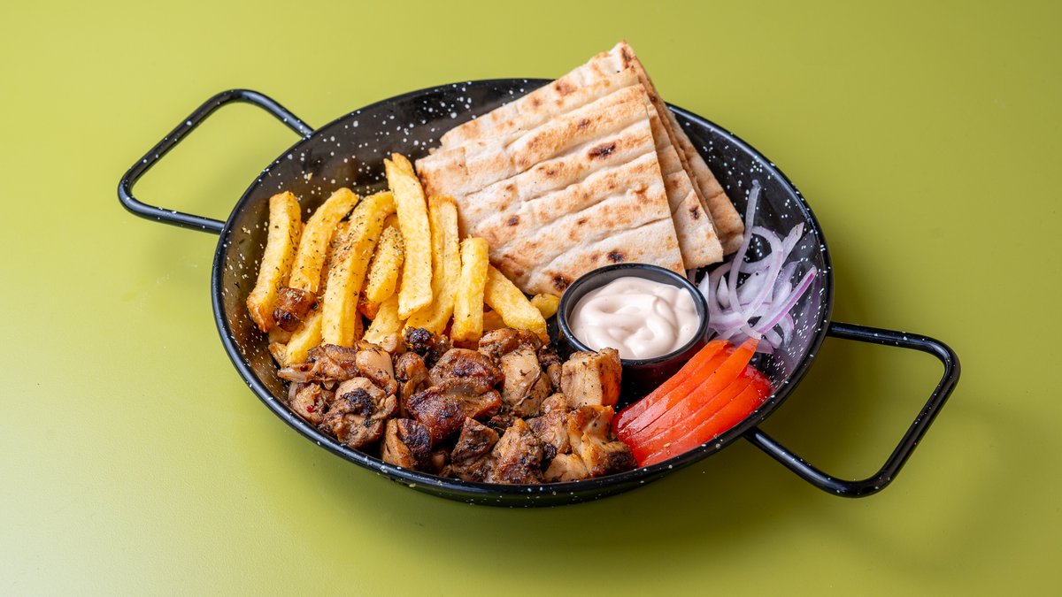 3 σουβλάκια από τρυφερό μπούτι χοιρινού ψημένα στη σχάρα. Σερβίρονται με ζεστή πίτα, φρέσκες πατάτες τηγανητές, ντομάτα, κρεμμύδι και τζατζίκι