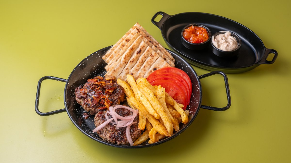 Ζουμερός κιμάς από μοσχαράκι και αρνί στην σχάρα, Σερβίρεται με τραγανό μπέικον, πίκλα κρεμμύδι, κερκυραϊκή σάλτσα ντομάτας, τυροκαυτερή chipotle, ντομάτα, ζεστή πίτα και φρέσκες πατάτες τηγανητές