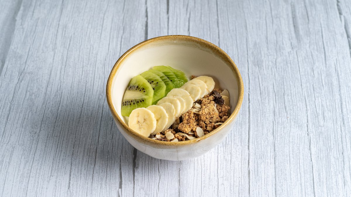 With almond flakes, honey, soft brown sugar, cinnamon, vanilla, sunflower oil, oats, chia seeds, raisins, cranberries, couverture chocolate, banana, kiwi, and yogurt