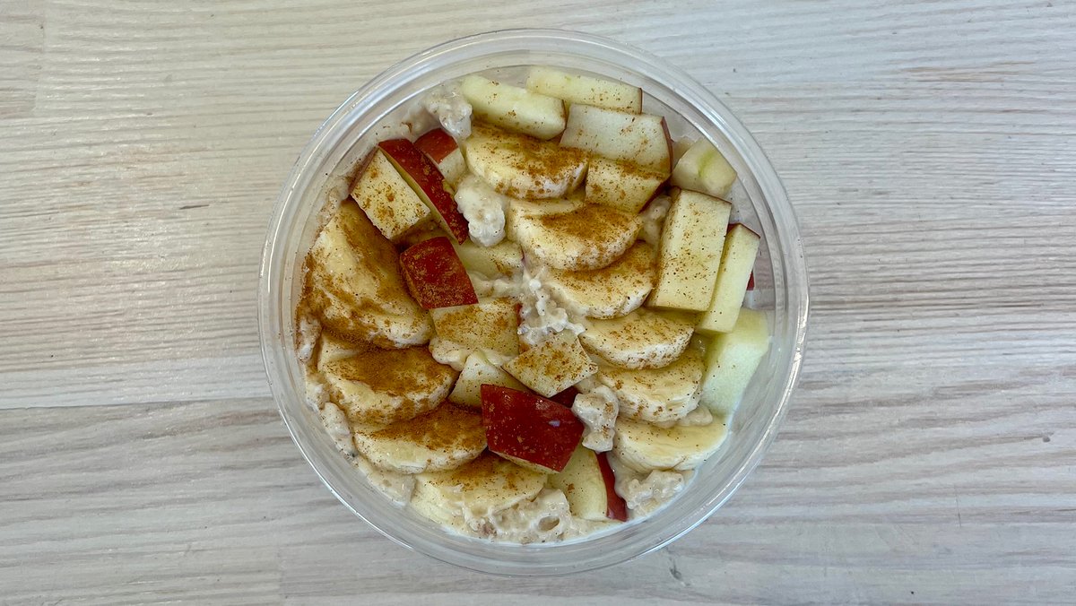 With oats, milk, vanilla, cinnamon, ginger, and your choice of added ingredients: chocolate flakes, chia seeds, flaxseed, dried fruits, kiwi, and apple