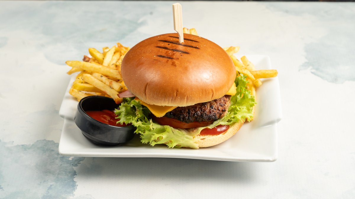 Handmade burger 200g made from 100% ground beef with cheddar cheese, tomato, lettuce, ketchup and mustard
