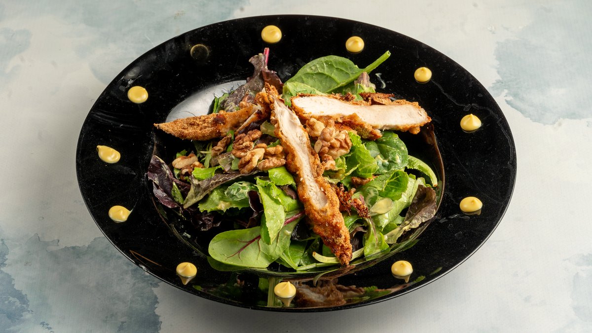 With grilled chicken, lollo rosso, spinach, walnuts and mustard dressing