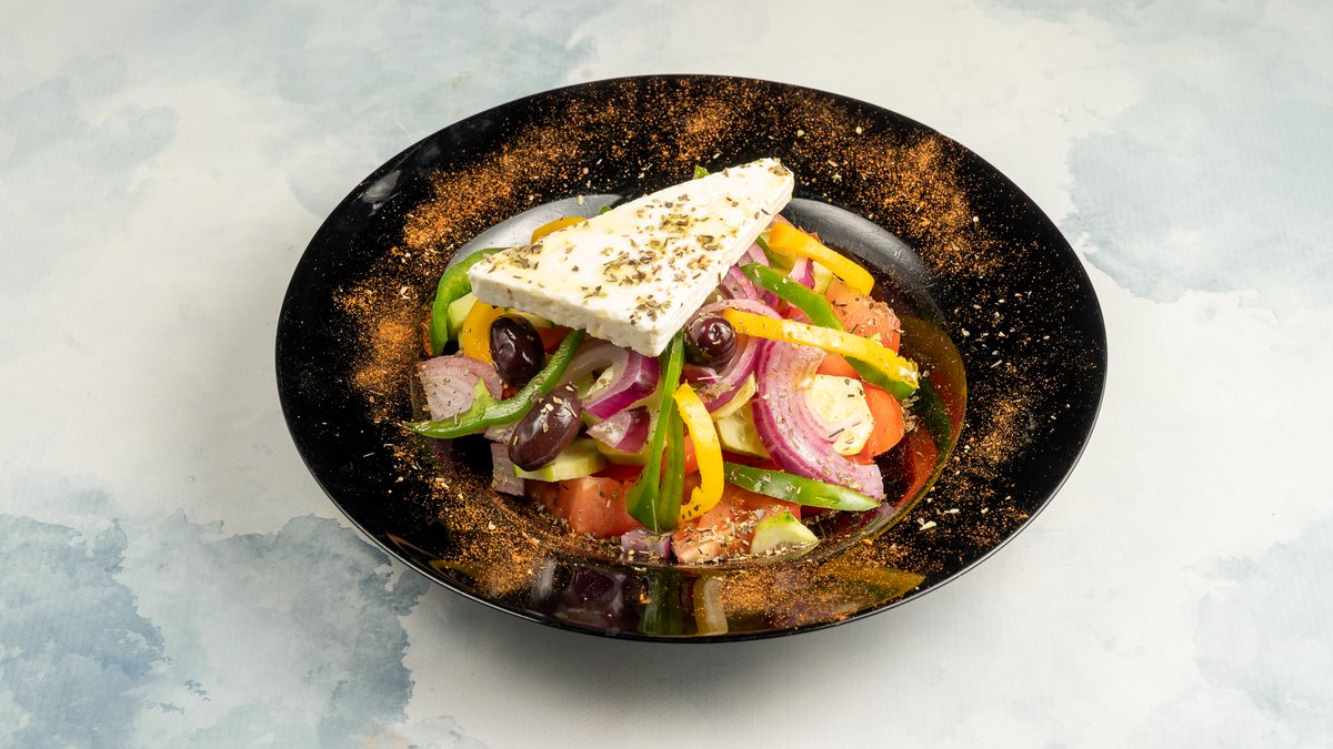With tomato, cucumber, colorful peppers, onion, feta cheese, caper olives and olive oil
