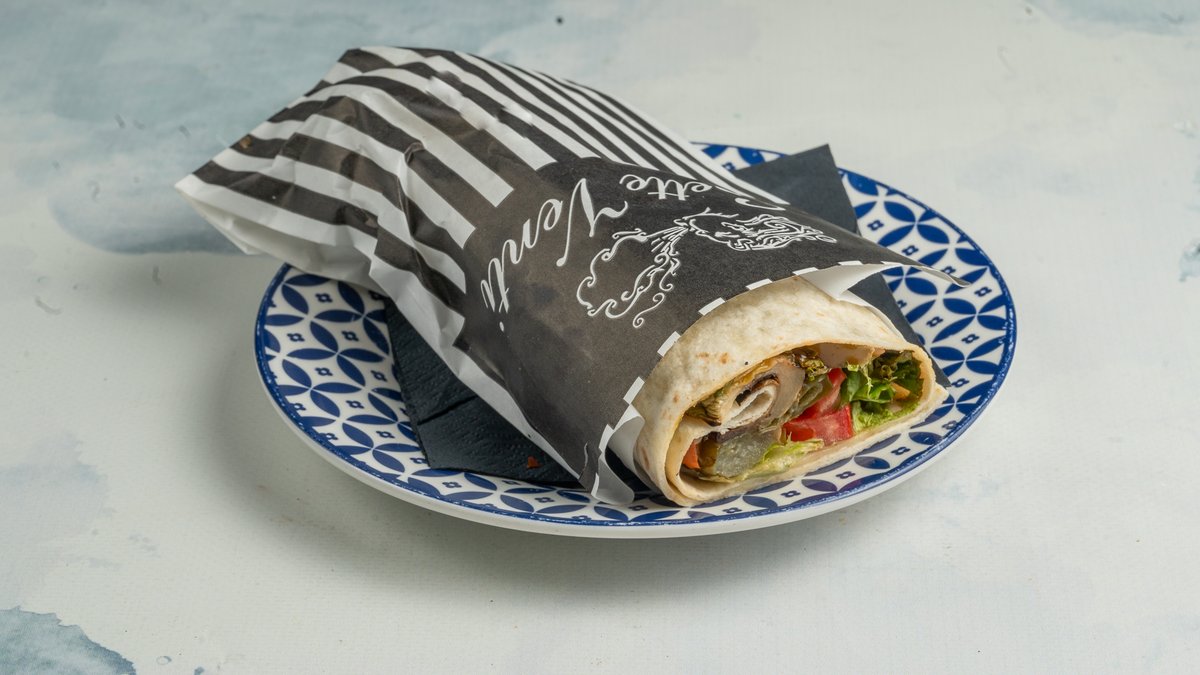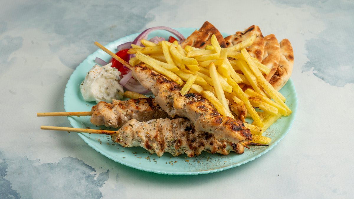 With pepper, zucchini, eggplant, mushrooms, tomato and sweet and sour sauce. Served with french fries