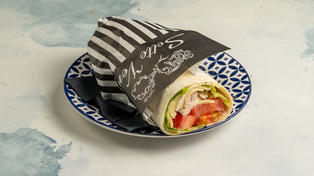 With grilled chicken, lettuce, tomato, edam cheese, and mustard sauce