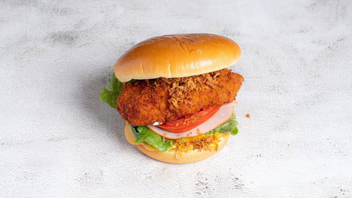 Ψωμί brioche με κοτόπουλο φιλέτο crispy, μαρούλι σγουρό, γαλοπούλα καπνιστή, ντομάτα, crispy onion και golden BBQ sauce