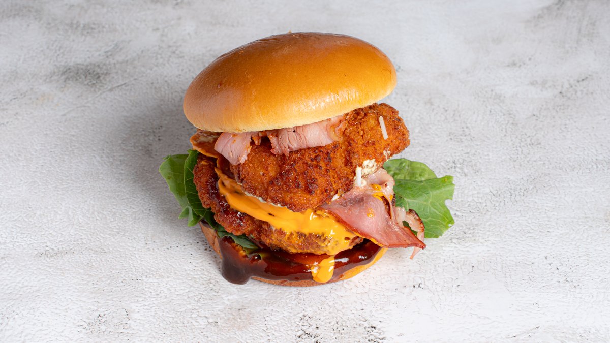 Ψωμί brioche με κοτόπουλο crispy διπλό, μαρούλι σγουρό, διπλό μπέικον καπνιστό, διπλό cheddar, ντομάτα και BBQ sauce