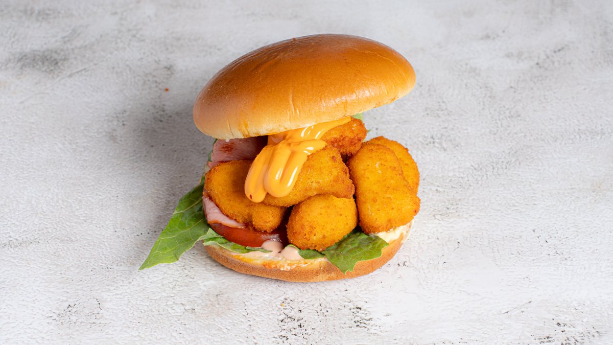 Ψωμί brioche με chicken nuggets bites, ντομάτα, μαρούλι σγουρό, cheddar, aioli sauce και BBQ sauce