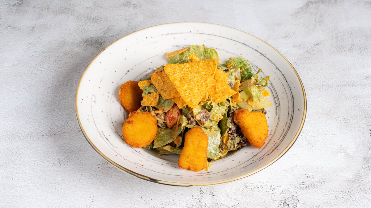 Σαλάτα με μαρούλι, καλαμπόκι, crispy chicken nuggets, cheddar, flakes κρεμμυδιού αποξηραμένου, ντοματίνια, καρότο ζουλιέν και sauce