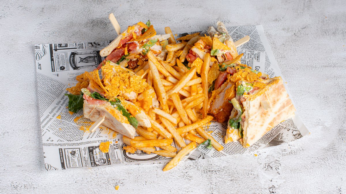 Πίτα χειροποίητη με φιλετάκια κοτόπουλο crunchy, cheddar, γαλοπούλα καπνιστή, ντομάτα, μαρούλι σγουρό, Doritos, μαγιονέζα και BBQ sauce. Συνοδεύεται από πατάτες τηγανητές