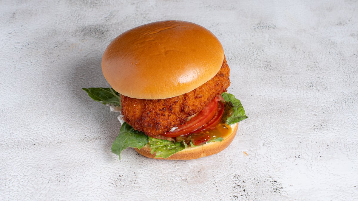 Ψωμί brioche με κοτόπουλο φιλέτο crispy, μαρούλι σγουρό, ντομάτα και sweet chili sauce