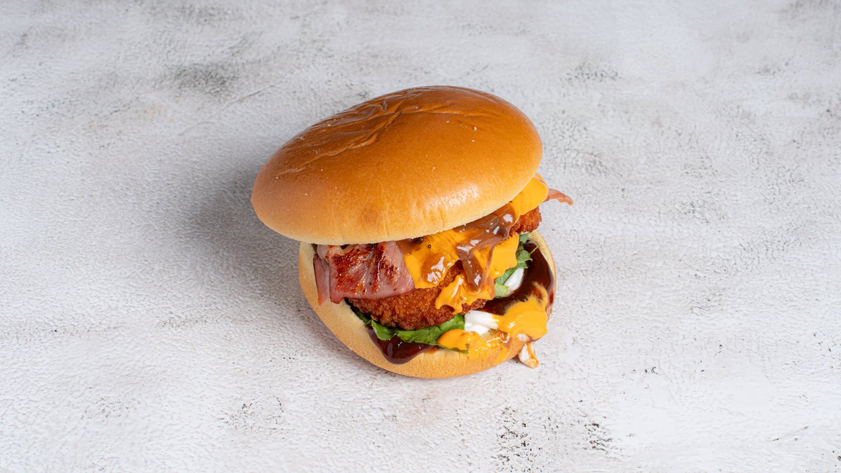 Ψωμί brioche με κοτόπουλο crispy, ντομάτα, μαρούλι σγουρό, cheddar, μπέικον καπνιστό, french sauce και BBQ sauce