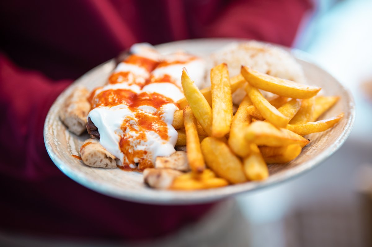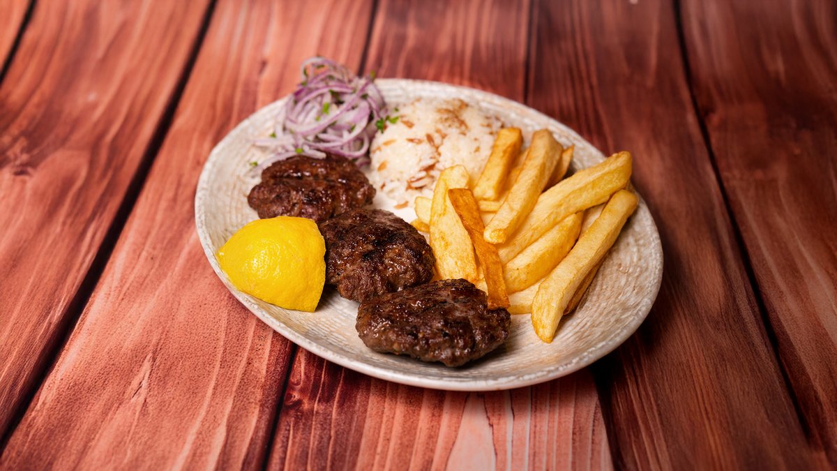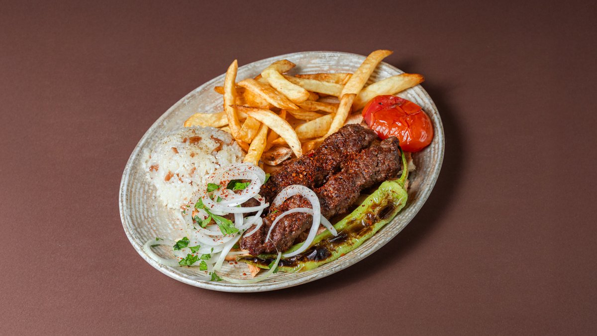 Ψιλοκομμένο μοσχαρίσιο κρέας με πίτα γιαούρτι και σάλτσα ντομάτας. Συνοδεύεται με πατάτες τηγανητές και ατζέμ πιλάφι