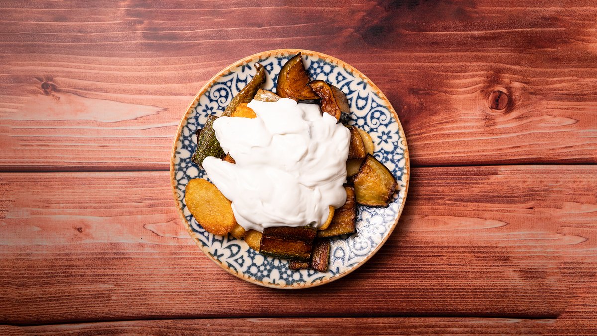 Τηγανητά κολοκυθάκια, πιπεριές, πατάτες, μελιτζάνες με γιαούρτι