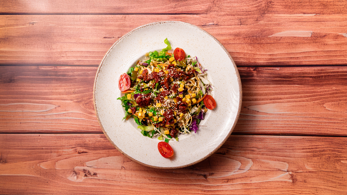 Μαρούλι, λόλα λιαστή ντομάτα, χρωματιστές πιπεριές λάχανο, καλαμπόκι, σουσάμι και σως βινεγκρέτ