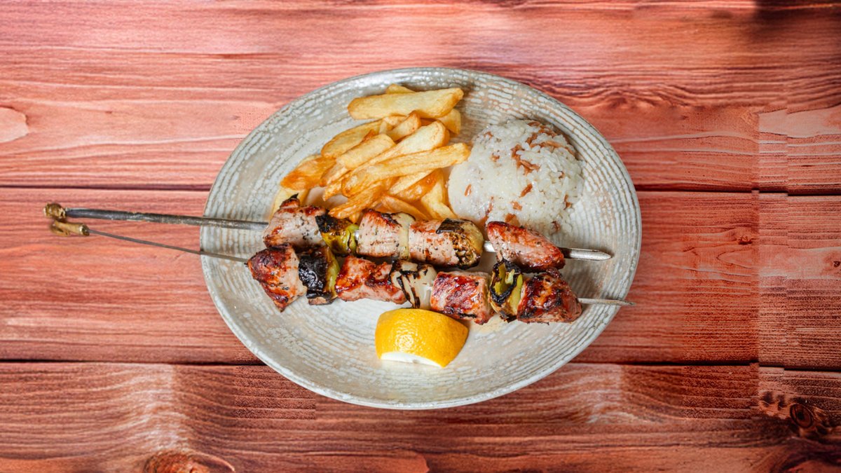 Κιμά σουβλάκι με πίτα, γιαούρτι και σάλτσα ντομάτας. Συνοδεύεται με πατάτες τηγανητές και ατζέμ πιλάφι