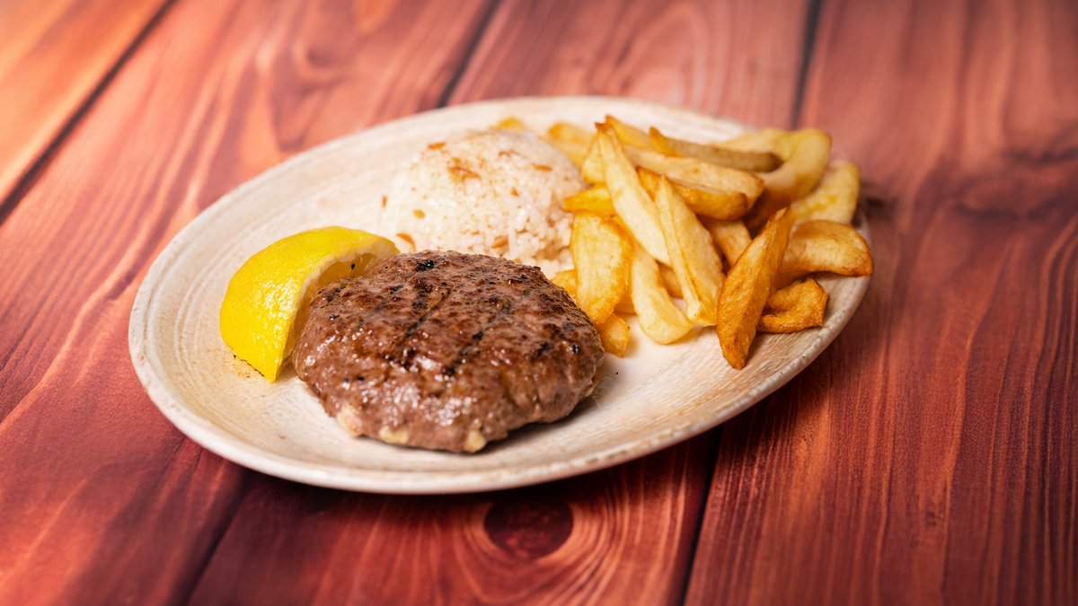 3 Μπιφτέκια καυτερά με πίτα και γιαούρτι. Συνοδεύεται με πατάτες τηγανητές και ατζέμ πιλάφι